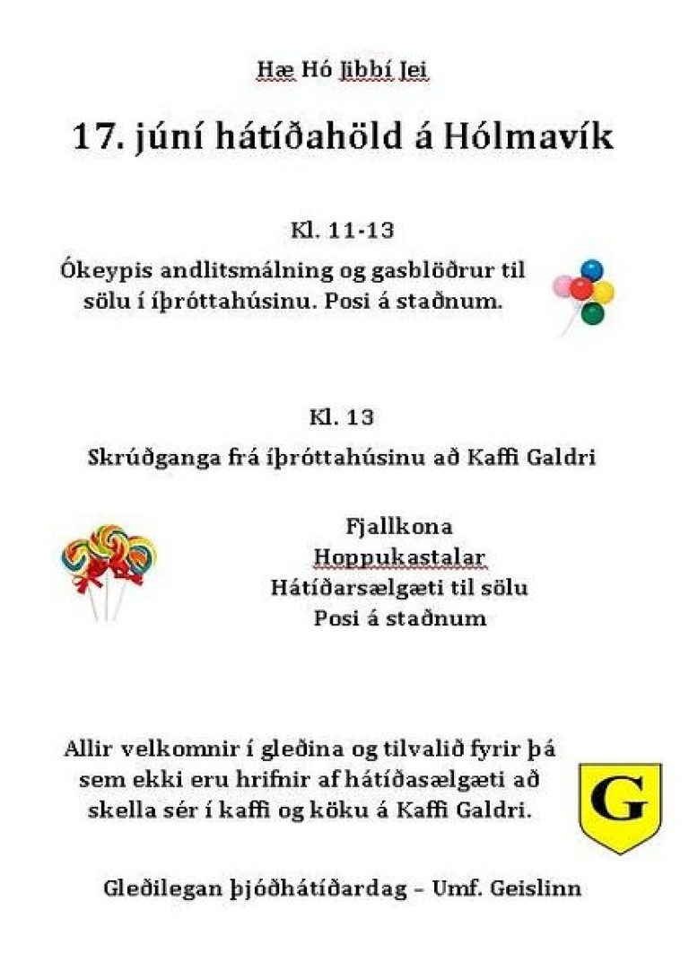 Á morgun þjóðhátíðardag okkar Íslendinga mun Umf.Geislinn sjá um hátíðarhöldin eins og venjulega. Frá kl. 11-13 verður boðið upp á andlitsmálun í Íþróttamiðstöðinni og síðan verður lagt af stað í skrúðgöngu kl. 13 en hátíðardagskrá verður við Galdrasafnið.
