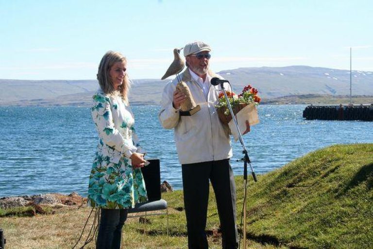 Ingibjörg Valgeirsdóttir veitti listaverkinu viðtöku fyrir hönd Strandabyggðar og skýrði frá því við sama tækifæri að Einar hefði hlotið Menningarverðlaun Strandabyggðar árið 2012, en tómstunda-, íþrótta- og menningarnefnd Strandabyggðar tók ákvörðun um verðlaunin sem nú voru veitt í þriðja sinn. Við óskum Einari innilega til hamingju með verðlaunin og Strandamönnum öllum til hamingju með hið glæsilega og seiðandi listaverk.