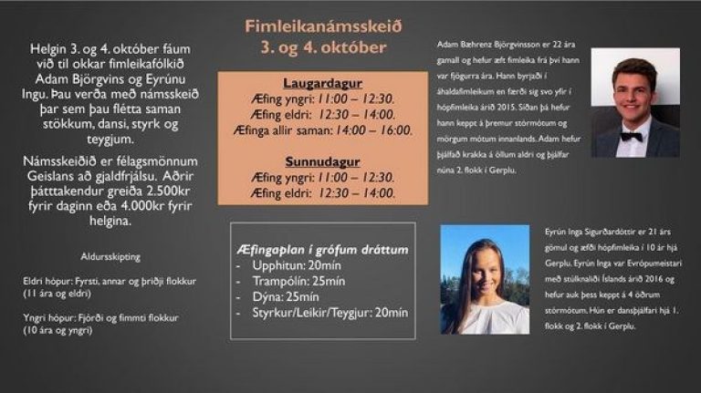 Geislinn býður upp á skemmtilegt fimleikanámskeið 3.-4. október n.k. Skráning fer fram hér og nánari upplýsingar má sjá á meðfylgjandi mynd eða hjá Geislanum á facebook
