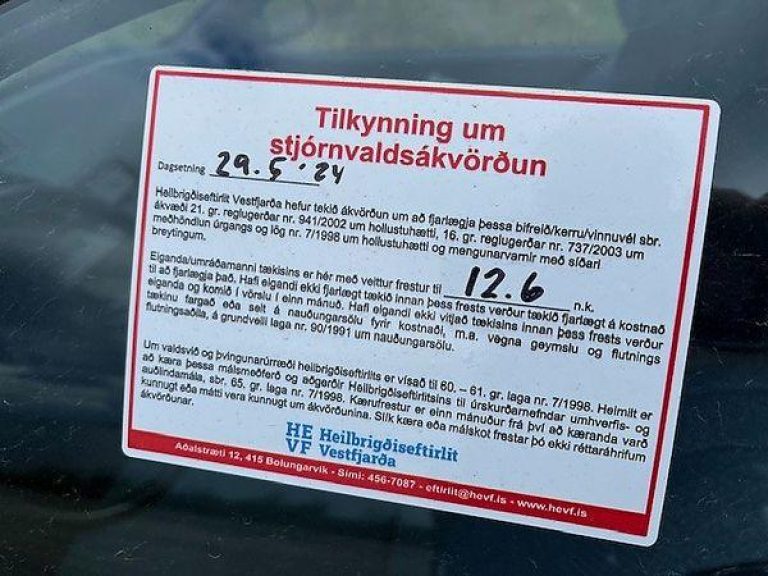 "Þann 29. maí 2024. fóru starfsmenn Heilbrigðiseftirlits Vestfjarða í eftirlitsferð um Hólmavík. Límdar voru tilkynningar á númerslausa bíla, samtals 22 stk. Bílarnir eru staðsettir á lóðum Strandabyggðar og lóðum fyrirtækja og einstaklinga. Gefin var frestur til 12. júní í 2024 til að fjarlægja viðkomandi hlut. Límdir voru rauðir miðar sem tilkynna stjórnvaldsákvörðun um að bíllinn verði fjarlægður".