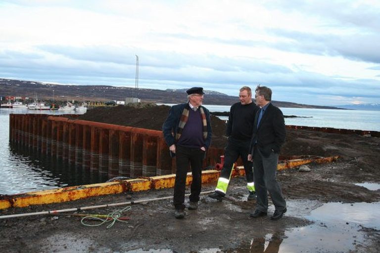 Salti var landað á hafskipabryggjunni í Hólmavíkurhöfn í dag fyrir rækjuvinnsluna Hólmadrang. Verið er að endurnýja stálþil á bryggjunni en hún hefur verið lokuð frá því í september vegna framvkæmdanna sem eru í fullum gangi. Verktakinn Ísar ehf. undirbjó bryggjuna fyrir löndunina ásamt starfsmönnum hafnarinnar en Hólmadrangur greiðir kostnað vegna þessa. Að sögn Sigurðar Marinó Þorvaldssonar hafnarvarðar gekk löndunin mjög vel og er afar gott að geta orðið við þessari beiðni Hólmadrangs. Endurbætur á bryggjunni eru nauðsynlegar og til mikilla bóta fyrir alla hagsmunaaðila þar sem ástand hennar var orðið slæmt. Áætluð verklok vegna endurbyggingar stálþilsins eru 1. mars 2012 og verður farið í útboð á þekjunni í framhaldi af því.