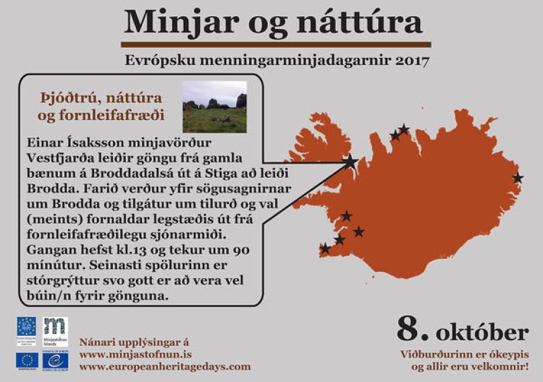 Í tilefni Menningarminjadaganna leiðir Einar Ísaksson minjavörður Vestfjarða göngu frá gamla bænum á Broddadalsá út á Stiga að leiði Brodda. Farið verður yfir sögusagnirnar um Brodda og tilgátur um tilurð og val (meints) fornaldar legstæðis út frá fornleifafræðilegu sjónarmiði. Gangan hefst kl. 13:00, 8. október og tekur um 45 mínutur hvora leið. Seinasti spölurinn er stórgrýttur svo gott að vera vel búin fyrir gönguna.
