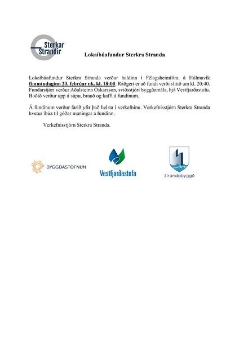 Lokaíbúafundur Sterkra Stranda verður haldinn í Félagsheimilinu á Hólmavík fimmtudaginn 20. febrúar nk. kl. 18:00. Ráðgert er að fundi verði slitið um kl 20:40. Fundarstjóri verður Aðalsteinn Óskarsson, sviðsstjóri byggðamála, hjá Vestfjarðastofu. Boðið verður upp á súpu, brauð og kaffi á fundinum.
