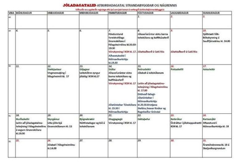 Hér ætlum við að birta atburðadagatal sem hægt er að prenta út ef fólk vill en þó ber að gæta þess að atburðir geta verið að birtast daglega í desember. Hér er hægt að nálgast dagatalið á pdf.formi