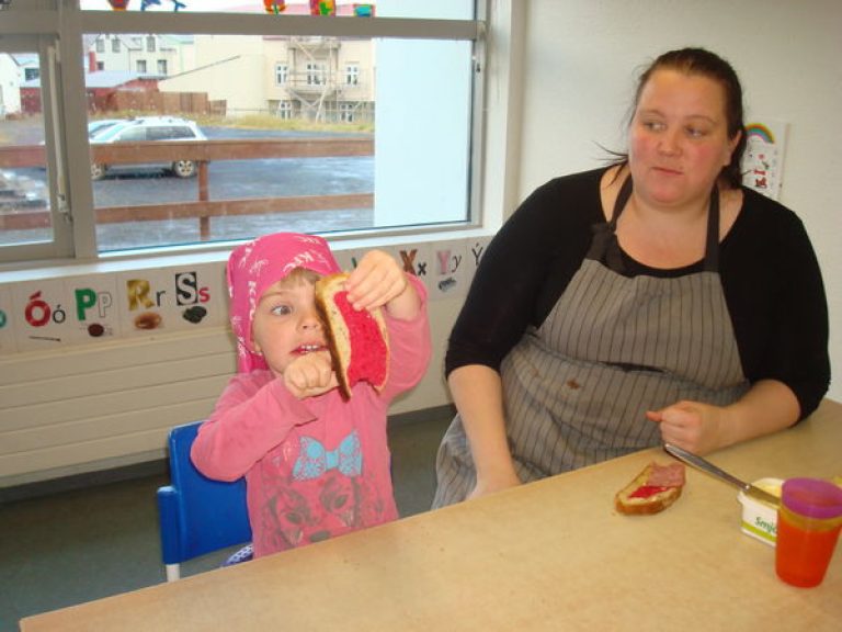 Í morgun fengum við bleika AB mjólk og bleika mjólk út á grautinn. Í hádeginu var bleikt vatn með matnum. Í síðdegishressingunni fengum við svo nýbakað brauð sem öllum að óvörum var fagurbleikt í miðjunni.