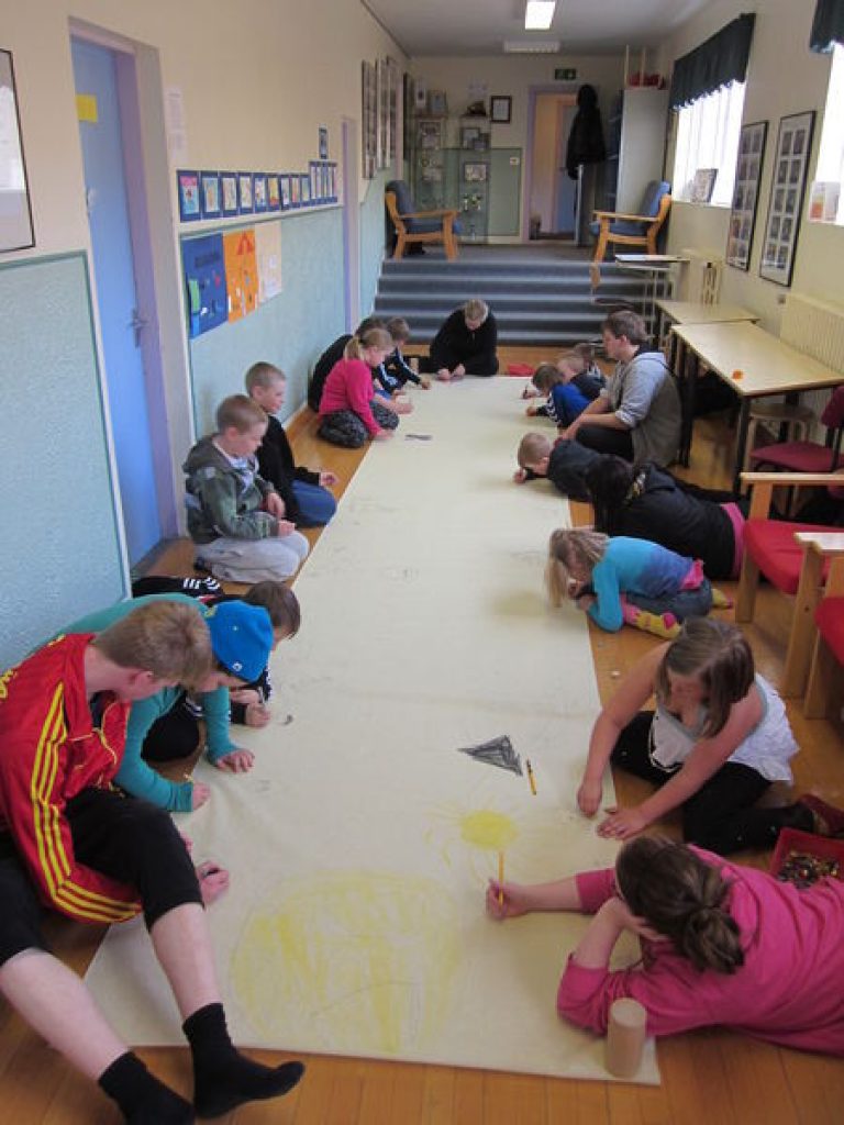 Það var skemmtileg stemmningin á langa ganginum í skólanum í dag þegar nemendur í 3. og 9. bekk tóku höndum saman og teiknuðu risastóra sumarmynd sem prýðir nú loftið á ganginum. Það er hreint mögnuð tilfinning að labba undir myndina sem gleður augu ungra sem aldinna. Að sögn nemenda er myndefnið allt tilheyrir góðu sumri m.a. blóm, sól, grill, risaeðlur, ís, kanínur, hjörtu, refur, bátur, flugur, fuglar, fiðrildi, fótboltavöllur, hús og fleira skemmtilegt. Andrúmsloftið var mjög afslappað og sköpunargleðin í hámarki þar sem nemendur unnu saman undir stjórn Hrafnhildar Guðbjörnsdóttur, Árnýjar Huldar, Naomi og Juliu sem eru í starfskynningu hér í grunnskólanum þessa viku.
