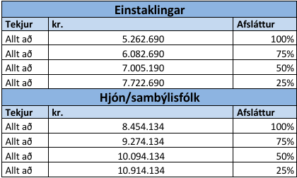 Afsláttur elli- og örorkulífeyrisþega getur þó að hámarki 84.050 kr. árið 2025. Afslátturinn er tekjutengdur. Þessar fjárhæðir miðast við árstekjur (heildartekjur) skv. skattframtali næstliðins árs og gilda fyrir lækkun fasteignaskatts á álagningarári.