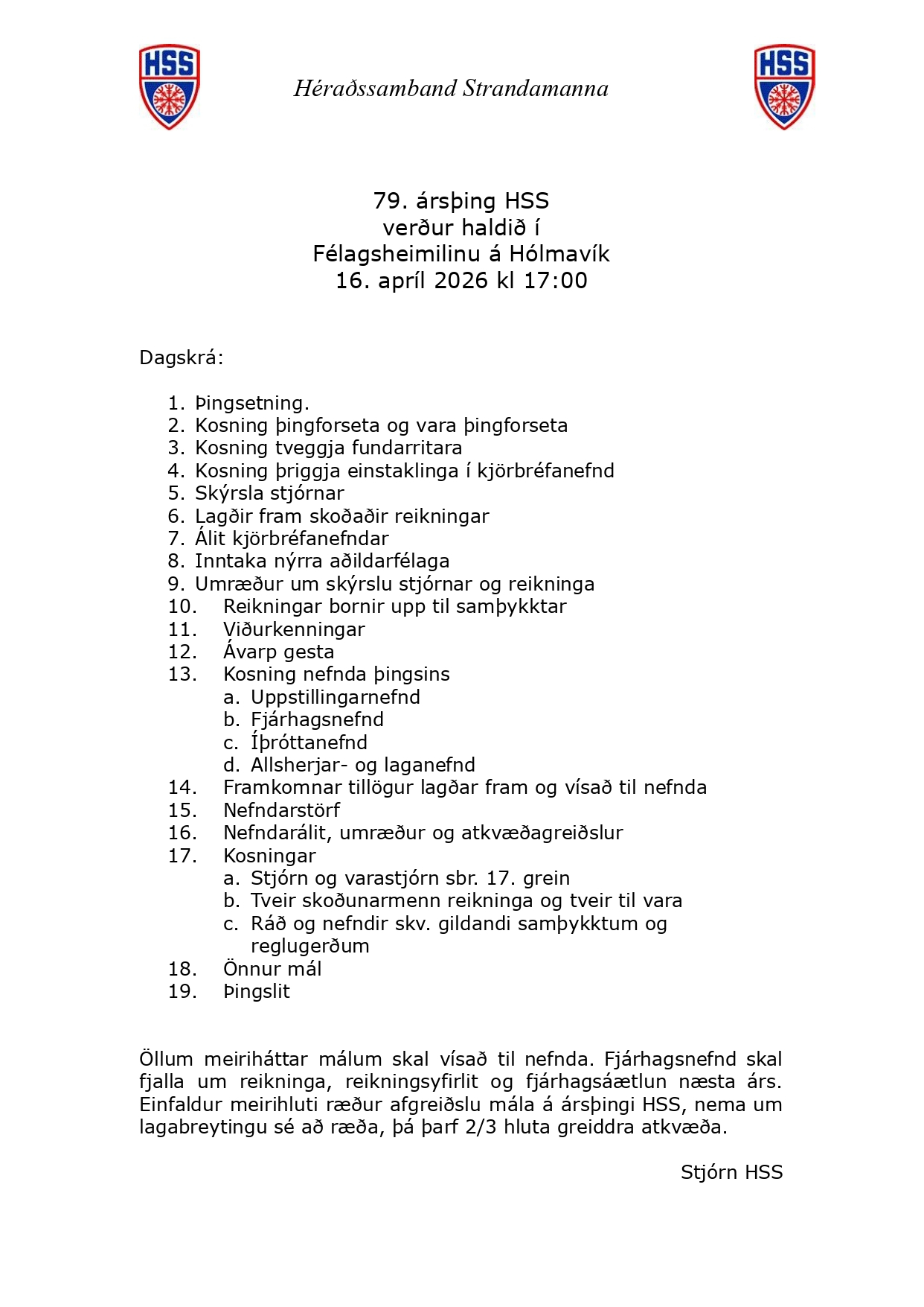 Einfaldur meirihluti ræður afgreiðslu mála á ársþingi HSS, nema um lagabreytingu sé að ræða, þá þarf 2/3 hluta greiddra atkvæða.